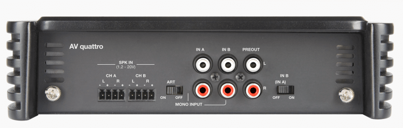 O AV quattro είναι ένας ενισχυτής τεσσάρων καναλιών που μπορεί να λειτουργήσει σε τέσσερα, τρία, δύο κανάλια, παρέχοντας συνολική ισχύ 1700 W (RMS). Έχει σχεδιαστεί για να χειρίζεται περίπλοκες διαμορφώσεις όπως εμπρός / πίσω και πολυκαναλικά συστήματα. Ο AMP (Processor Management Amplifier) ελέγχει συνεχώς το σύστημα κατάστασης λειτουργίας και επικοινωνεί με τον χρήστη μέσω 4 διαφορετικών χρωματιστών λυχνιών LED, που βρίσκονται στην επάνω επιφάνεια του πλαίσιου.Το ART (αυτόματη ενεργοποίηση/απενεργοποίηση απομακρυσμένου ελέγχου) ενεργοποιείτε όταν δεν υπάρχει διαθέσιμο απομακρυσμένο σήμα από την πηγή. έως 24 dB / Οκτ. οι διασταυρώσεις κλίσης επιτρέπουν την κατασκευή εμπρόσθιων οπίσθιων, εμπρόσθιων ή πολλαπλών ενισχυμένων συστημάτων, εξασφαλίζοντας παράλληλα ένα μη φιλτραρισμένο σήμα εξόδου για την επέκταση του συστήματος.